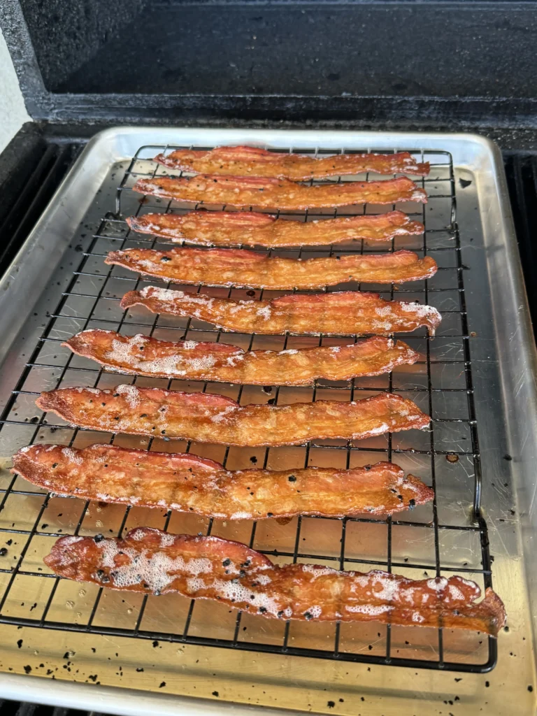 - Add the wire rack with bacon into the smoker alongside the chicken, smoking until the bacon is crispy and the chicken reaches an internal temperature of 155°F.