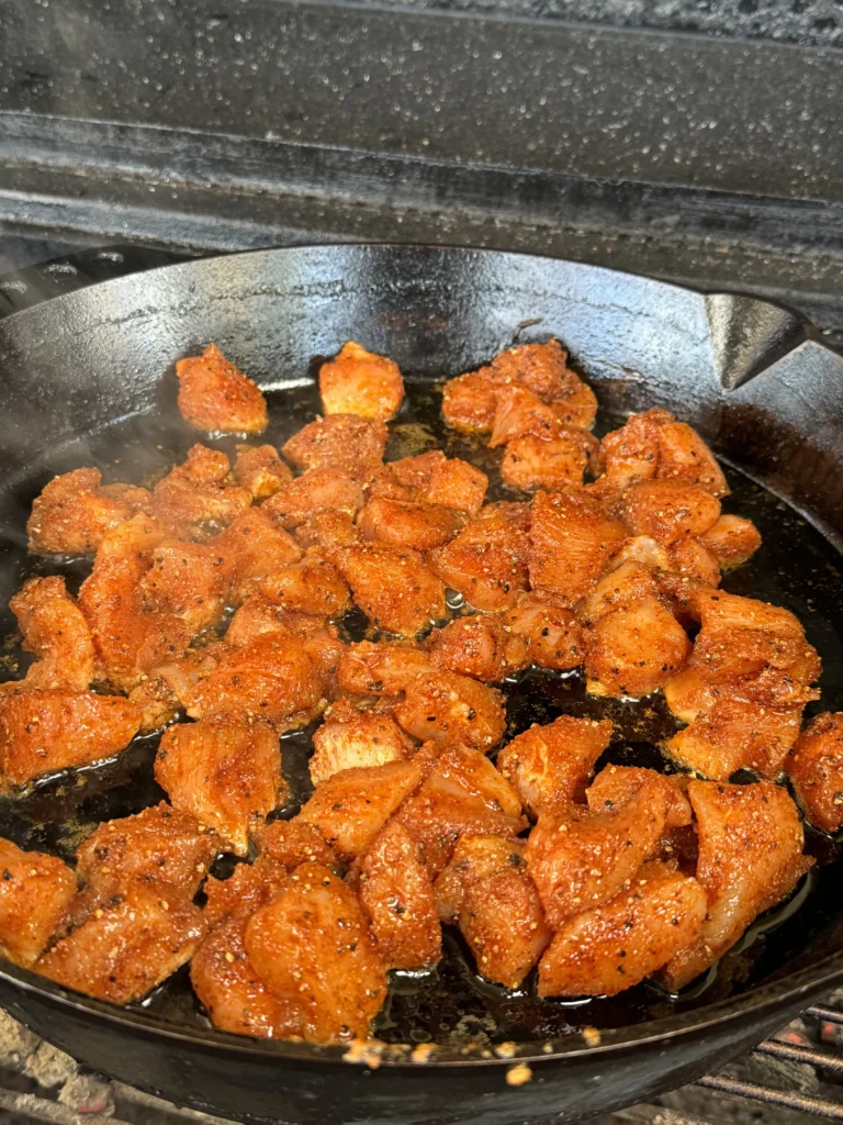 Once marinated, cook the chicken in a hot cast-iron skillet with a bit of avocado oil. The key is to ensure that each piece of chicken has contact with the skillet, which gives it a beautiful sear and locks in the flavors. Cook for about 4 minutes, then stir and continue cooking for another 3-4 minutes until the chicken is cooked through and has a nice, smoky char on the outside. Remove the chicken from the skillet and keep it warm.