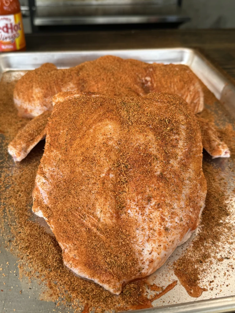 - Spatchcock chicken, apply red hot sauce as binder, and season with hot honey BBQ rub.