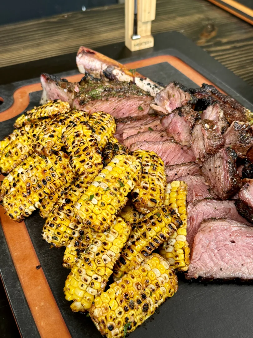 - Slice the rested steak and serve it alongside the corn ribs. Enjoy!