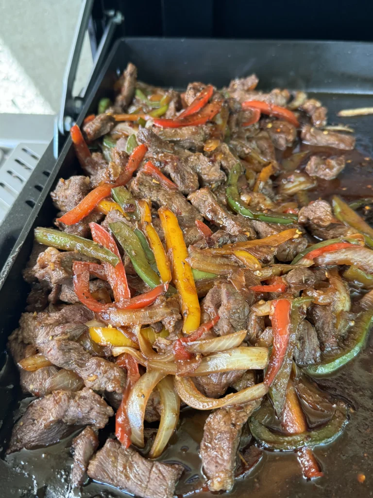 Once your steak strips are cooked to perfection, add the previously cooked peppers and onions back to the griddle. Mix everything together and then pour in the pepper steak sauce. Stir the mixture continuously to ensure that all the steak and vegetables are coated with the sauce.
