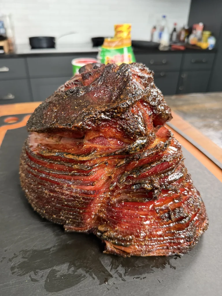 Smoking takes slightly longer than oven baking. Plan for an extra 30 minutes to an hour. The payoff is complex flavor that tastes like you spent all day on it. The smoke penetrates between the spiral cuts. Every slice has sweet honey, Cajun spice, and wood smoke.