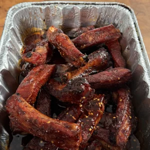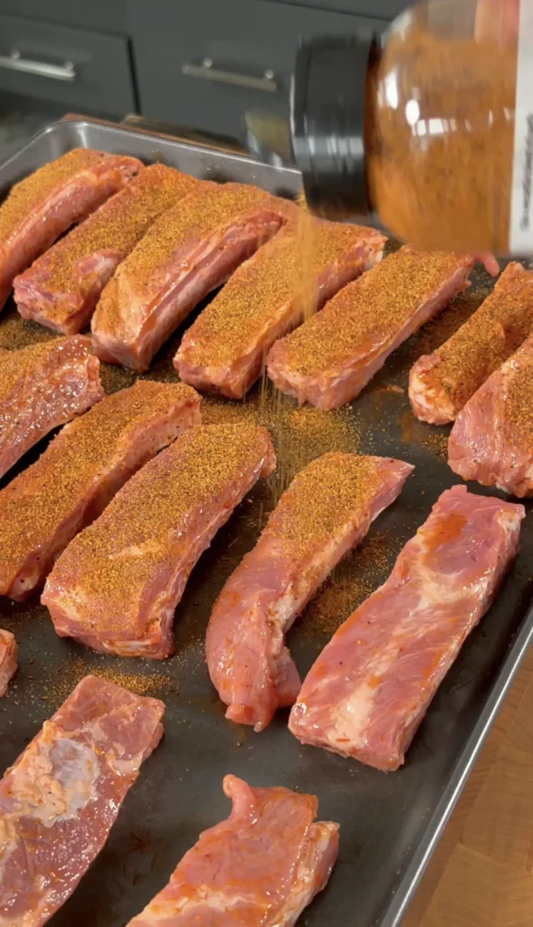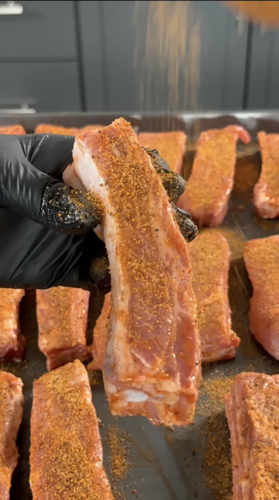 Sprinkle ¼ cup BBQ rub over the ribs. Use a sweet-style rub with brown sugar base. Toss the ribs to coat them evenly on all sides. Make sure every piece gets seasoned. The individual pieces make this easier than full racks.