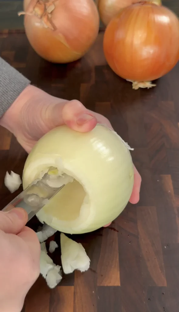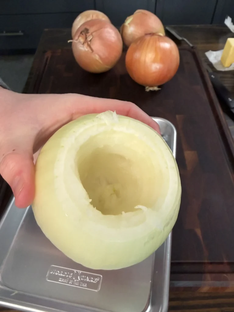 Cutting through the bottom of the onion when hollowing creates escape route for butter. Be careful not to puncture the root end. The onion should be a sealed container. Check after hollowing by holding it up to light – you shouldn’t see through the bottom.