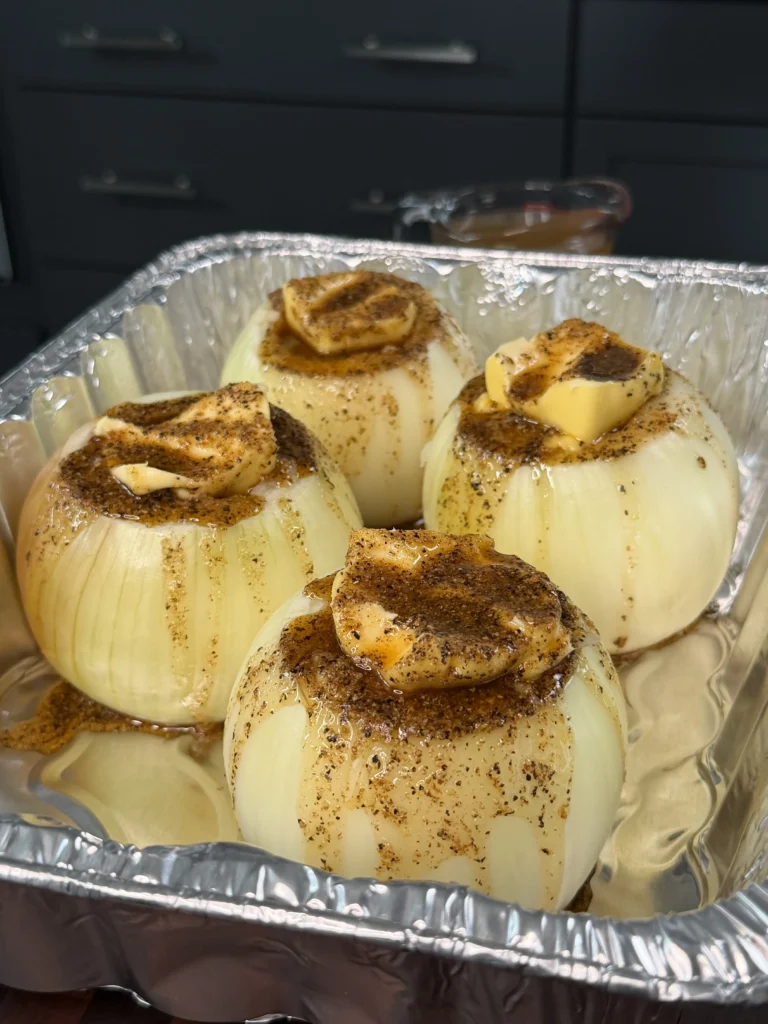 - Make seasoned butter: Per onion, combine 4 tablespoons softened butter, 1 teaspoon garlic powder, ½ teaspoon smoked paprika, ½ teaspoon salt, ¼ teaspoon pepper. Crush beef bouillon cube if using and mix in. Mix until evenly combined.