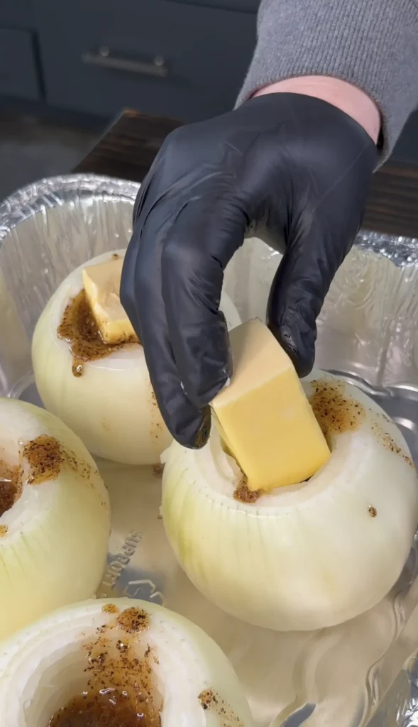 The butter will melt and flow downward during cooking. Starting with butter packed into the center and scores ensures it reaches all parts of the onion. Don’t worry about perfect distribution at this stage. The grilling process handles that.