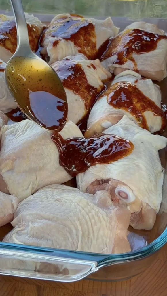- Coat the chicken thighs evenly in the marinade, making sure the skin side is covered. Let sit at room temperature for 30 minutes or refrigerate up to 4 hours.